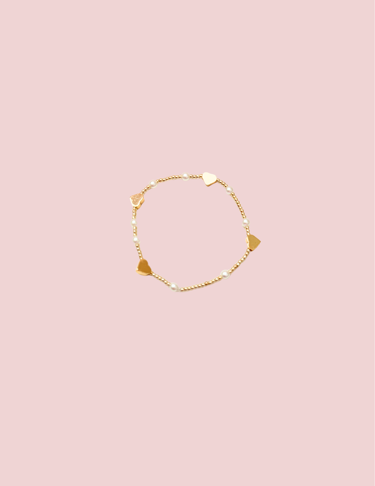 Made with 2mm gold beads, pearls, and 14k gold plated hearts to accent a simple but bold Valentine’s Day stack- perfect for your round stacks as well